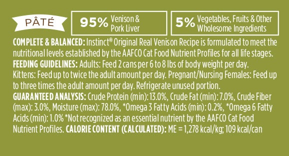 Venison and pork liver are the first two ingredients in Instinct Grain-Free Venison Formula Canned Cat Food, with zero grains and gluten pet owners can feel good about the food their cat is eating. Completely balanced for all life stages and breeds, your cat can enjoy this food for a lifetime. With omega fatty acids, high quality protein rich venison, and added fruits and veggies, Nature's Variety makes it easier than ever to keep your cat happy and healthy. Feed your cat a quality meal with Instinct Grain-Free Venison Formula Canned Cat Food.